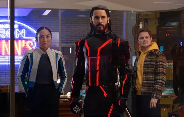Leto, effortlessly stylish with his dark Thor-like beard and slicked-back hair, plays Ares with an almost one-dimensional intensity - a lively paradox in the film's increasingly complex use of 3D technology. Athena, Leto's second-in-command, brilliantly portrayed by Jodie Turner-Smith, emanates a fierce, Grace Jones-esque confidence, sans emotions. And like their other counterparts, they're incased in fitted black bodysuits with glowing red or blue trims, that hint at their allegiance – to Dillinger or Encom.